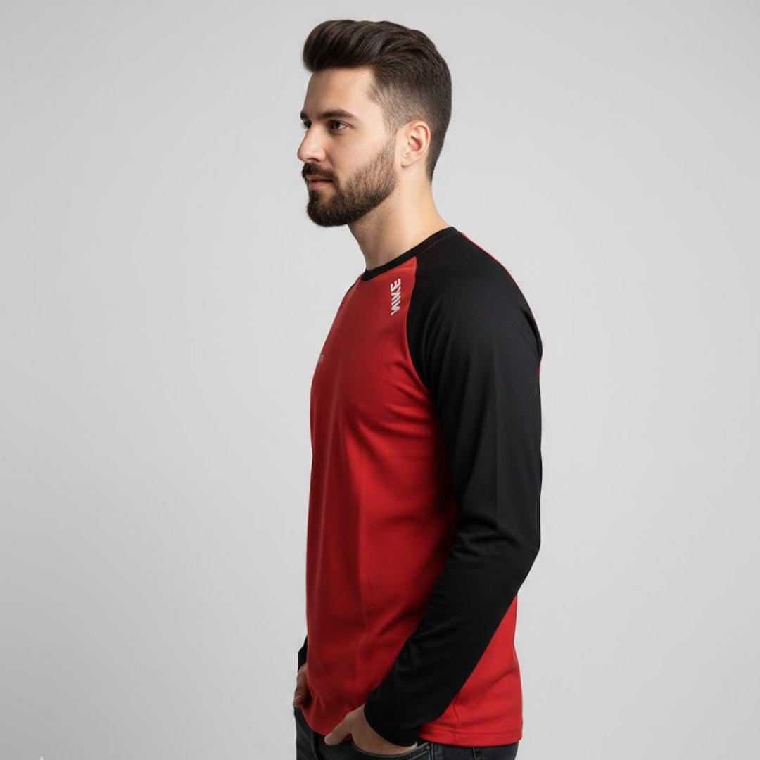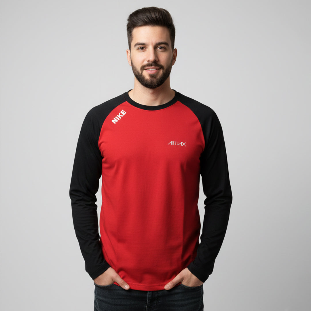 Add a pop of color to your athletic wardrobe with this vibrant red and black Nike Air Max long sleeve shirt. The bold color contrast, with the iconic Nike logo and Air Max branding, offers a modern and sporty look. Perfect for workouts or casual outings, this shirt is designed for comfort and flexibility with its breathable fabric and raglan sleeves, making it ideal for active lifestyles.
