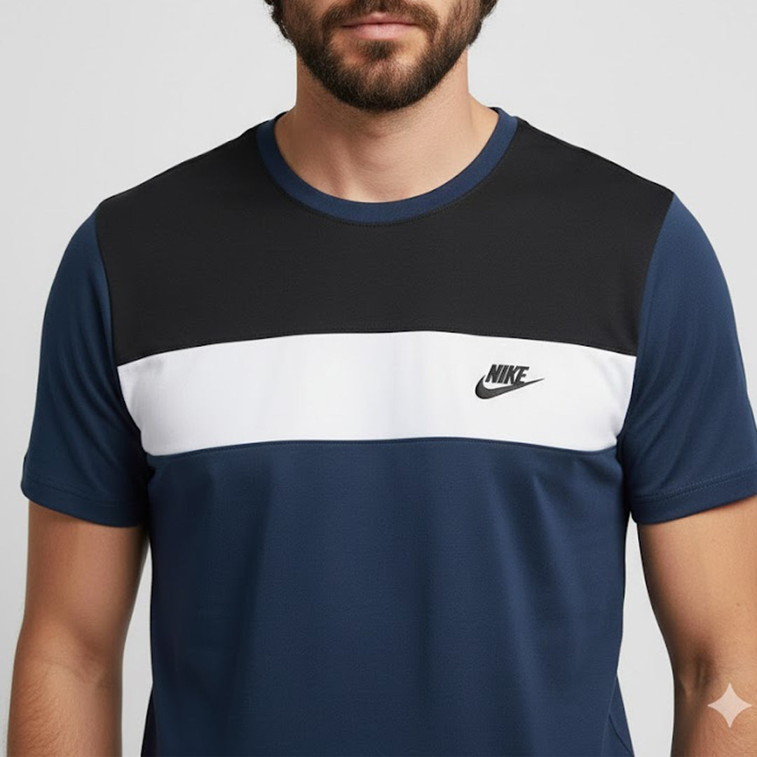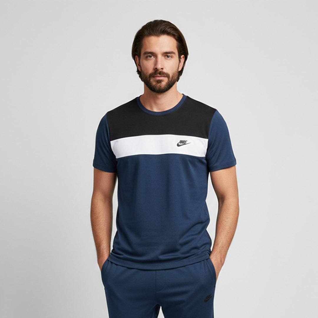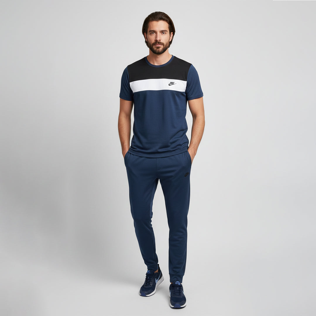 This Nike trackset in navy and black is the perfect blend of style and comfort. Featuring a color-blocked design with the iconic Nike logo, the set includes a breathable t-shirt and fitted joggers, designed for both performance and casual wear. The combination of navy and black adds a timeless touch, making it a versatile choice for athletes and fashion-conscious individuals alike.